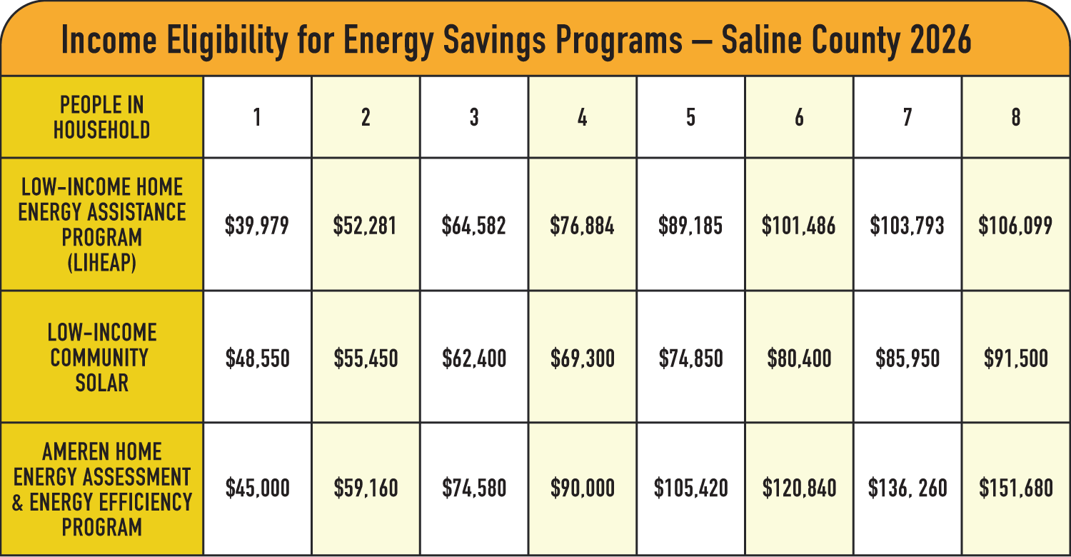 Low-income households in Saline County, Illinois can save money on their energy bills. Use the chart below to find out if you qualify for assistance programs based on your household size and income.